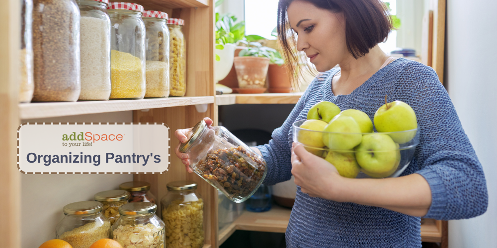 Downsize and combine items like with like. Once we saw what was left, zones were created for snacks, canned goods, mixes and health foods etc. Lazy Susans accommodate condiment bottles and tiered shelves showcase canned goods. Now my client can see what items are available without moving items around. Plastic bins now contain loose items like snack packs and sauce mixes. The first aid kit, medicines and infrequently used appliances are kept up and away behind closed doors. Paper goods and extra supplies are stored away in other cabinets to the left of the entrance.