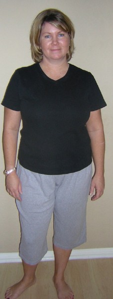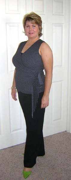 Solution: I chose clothes that were still “comfortable” to wear around the house but a step up from sweat pants. Empire seaming in tunics show off her great curves and longer hemlines elongate and slim her profile. Pointy toe ballet flats are as easy as flip flops. They are quick to slip on to run out the door and look fabulous! Pointy toes always elongate the profile. Her new clothes inspried her to change her hairstyle to a slightly more sassy look. She now has a wardrobe that is a bit younger for work, a bit edgier for home and, yes, even comfortable!